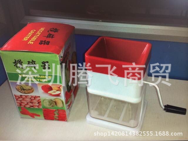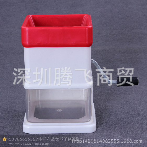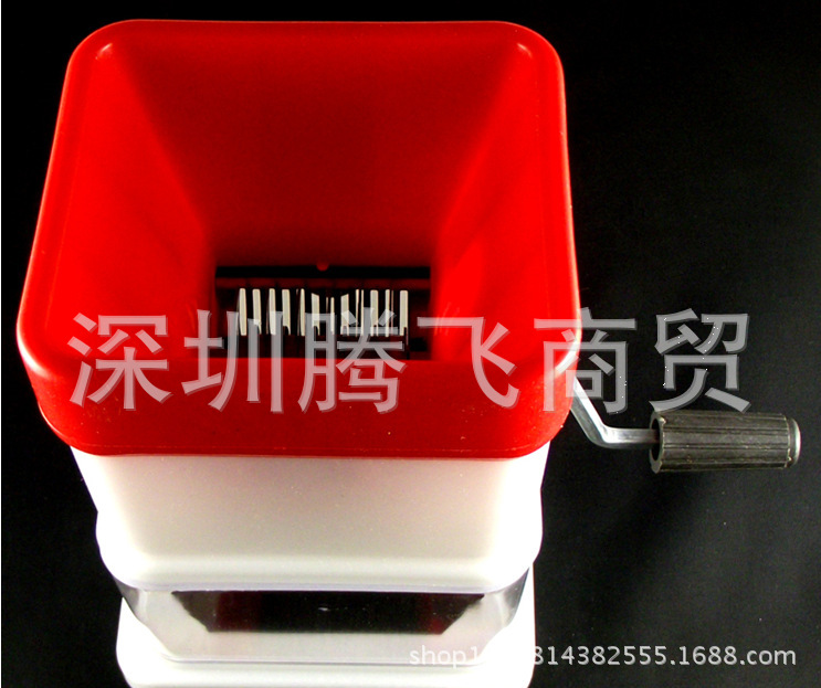 3.刚开始或操作过程中摇转手柄若遇到阻力,此时可采取慢速顺方向和逆方向多次摇转手柄释放阻力,也就是采取摇半圈的方式使蔬菜水果在容器内均匀嵌入刀叶中,随后便能顺利启动加快速度进行360度摇转了;请勿在摇转不动的情况下强行摇转手柄。