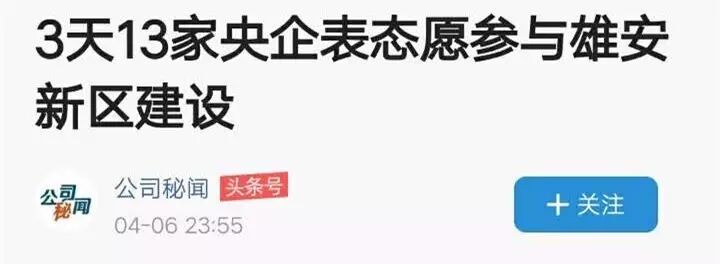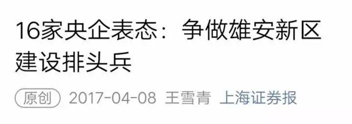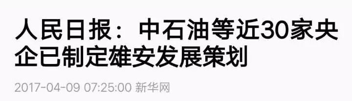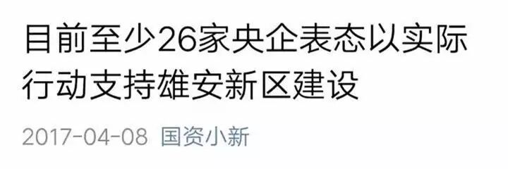 4月1日,新华社发布消息称,中共中央、国务院印发通知,决定设立河北雄安新区。据初步统计,截至4月9日下午,8天之内,已有中核集团、航天科技、航天科工、中船重工、中国电科、中国石油、中国石化、中国海油、南方电网、中国大唐、中国华电、中国国电、中国三峡集团、神华集团、中国联通、中国电子、国机集团、中铝公司、东航、中国建筑、国投公司、中国节能、中粮集团、招商局、中国五矿(中冶)、中国中铁、中国铁建、中国交建、新兴际华、中国能建、中国广核集团等31家央企集体发声“雄安新区建设不缺席,与发展政策同频共振”。