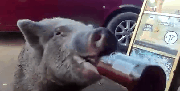之后,一名路人将一整瓶啤酒放在灰猪面前。有趣的是,它欢快地将这瓶啤酒在数秒内一饮而尽,喝完之后就将酒瓶扔到了地面上,期待地看向了另一瓶啤酒,当它发现那是一瓶满满的啤酒之后,便再一次将在数秒之内喝得一滴不剩,这引得围观群众哈哈大笑。之后,它又以同样的速度,饮完了第3瓶啤酒,这下彻底惊呆了众看客们。