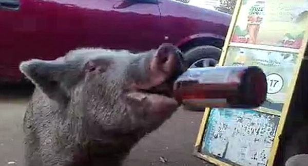 起初,只见一只灰猪游荡在一家酒吧外面,貌似渴坏了。当看到酒吧外的一个空啤酒瓶时,它立刻凑上前用自己的嘴巴十分巧妙地将其叼了起来。但当它意识到酒瓶里空荡荡的什么都没有时,又将酒瓶扔到了地面上。路人都感到十分有趣,纷纷上前围观。