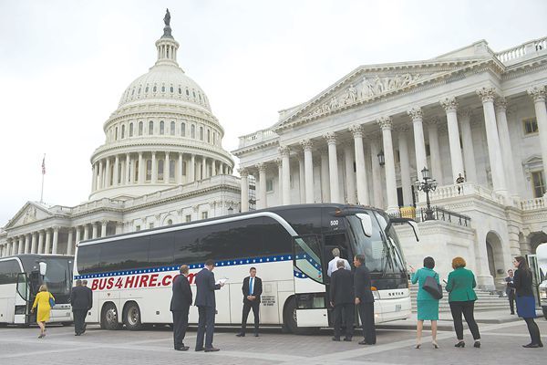 当地时间26日,由于总统特朗普要求变更开会地点,美国百位参议员在国会山登上大巴前往白宫出席朝鲜半岛局势吹风会。