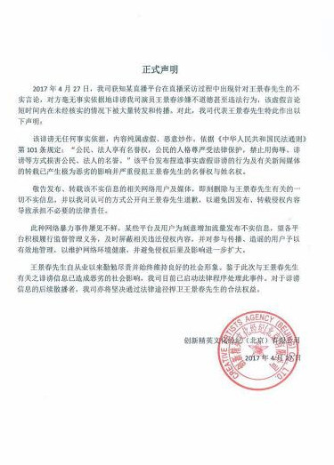晚间,王景春经纪公司发声明回应称:“该诽谤无任何事实依据,内容纯属虚假、恶意炒作。”此外,经纪公司还表示目前已启动法律程序处理此事件。