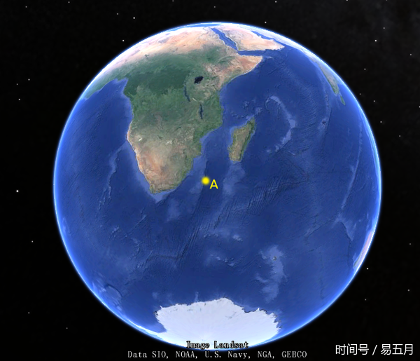 如图,把地球旋转到这个角度,标出A点。直接在软件下边栏可以查到这一点的经纬坐标:大约在南纬30°,东经37°左右。