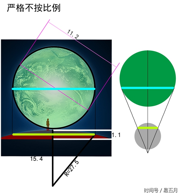 利用photoshop测量,地球直径11.2,人高1.5,月球弦长15.4,弓形高1.1,解出月球半径为27.5,和地球半径等视角的月球上的弦对应弧度0.4rad,对应的投影关系如右,带入月球半径计算出来这段弦长为707km,根据相似三角关系,带入地球半径和地月距离等数据,可以计算出拍照者距离地心大约40万公里,距离月球约2.1万公里。由于照片上的大小x=C•h/D,其中h为物体的实际大小,D为物距,C为像距,根据地球计算得出C=332,假设人高1.8米,那么这个人距离镜头400米。