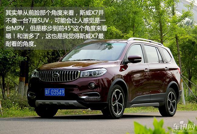 斯威X7的外观可以说从不同的角度看上去都会有不同的感觉,总体来说给人感觉很大气,确实有着作为一台7座SUV该有的FEEL,挑不出什么毛病,基本可以满足大部分人的审美,同时在一些细节方面也会给人很精致的感觉,开在路上回头率还是很高的。