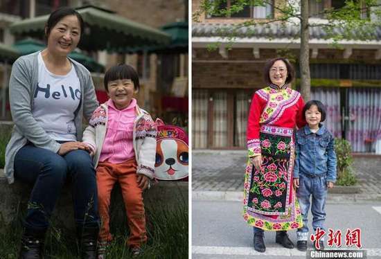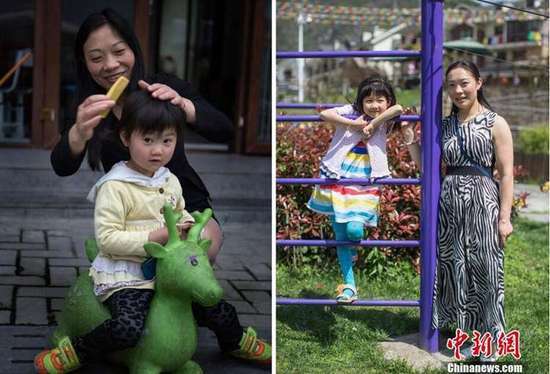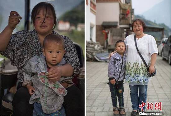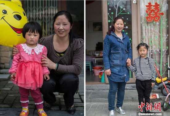 陈秀蓉在地震中失去一个女儿。每天上午八点半,身为导游的陈秀蓉就会换上漂亮的羌族服饰,来到高速路口等待旅游团的到来,她的职业是一名导游。每每有游客询问地震对她的影响,她的眼泪就会忍不住流下来。如今,小女儿徐瑊玏已经7岁,乖巧可爱,邻居都说她和姐姐长得很像,连陈秀蓉自己有时也会有错觉,仿佛大女儿又回到了自己的身边。(所有组图中左图拍摄于2013年,右图拍摄于2017年)
