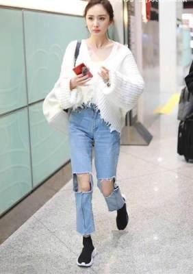 杨幂算是破洞裤的忠实爱好者,上身的渔网衫也是引领了潮流。随性自然的风格很符合现代人的审美,这也让破洞裤成为许多搭配挑选时的座上宾。简单好搭配,很好看。