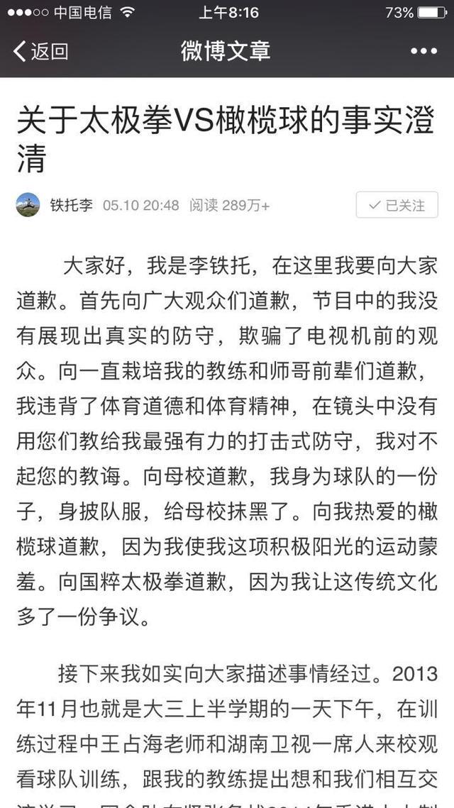 近日,陈式太极拳第十二代传人王占海,用太极功夫单挑三位橄榄球运动员的视频在网络中引起热议。作为参与节目录制的当事人在社交平台发声,这位名叫李铁托的橄榄球运动员直斥“节目有严重的逻辑漏洞和不合理的情节”,并向大众道歉。