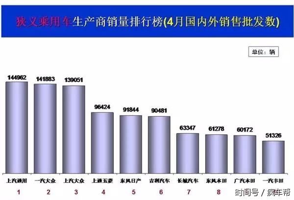 具体的车企我们先来看合资车企,首先最大的变化就是冠军易主啦!上汽通用一鼓作气盖过南北两个大众,成为4月销量榜第一。三者属于销量榜的第一梯队,并且差距不大,上汽通用销量144962辆,仅比第二名的一汽大众多了3000多辆,而上汽大众的销量也接近14万辆。