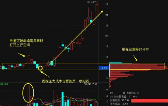 放量突破高位密集单峰是指股价经过一波上涨后,在高位调整震荡形成密集单峰。此时股价再次突破高位密集单峰,并创出近期历史新高。这说明多方力量重新聚集,拉升股价进入新一波上涨行情。