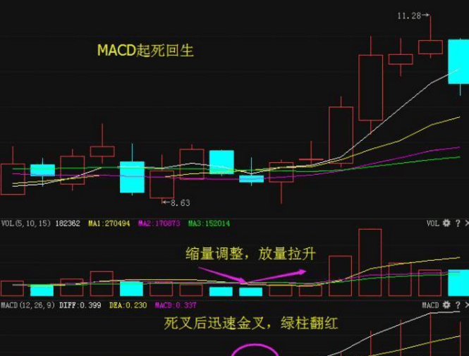 MACD“起死回生”战法指的技术特征是:MACD指标出现死叉后,在随后的几天内重新形成金叉。此现象多数是主力机构在拉升前进行震仓制造MACD指标死叉空头陷阱来骗取散户卖出手中筹码,然后迅速拉升股价,不让卖出筹码的散户有逢低重新买回的机会。