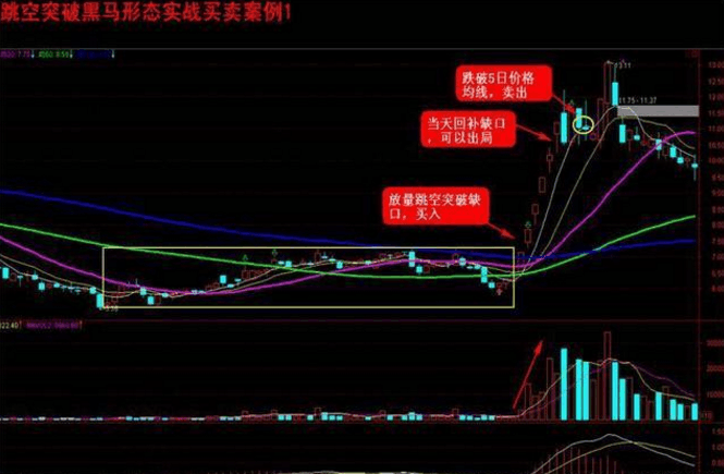 对于跳空突破黑马的打击最主要就是要打击它的突破缺口位,其次才是持续性缺口位。而卖出的点位则是行情末端衰竭性缺口的回补位。