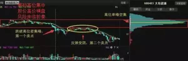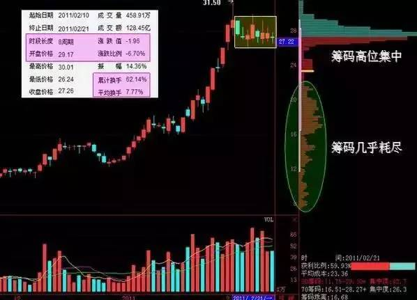 出货阶段主力成本区筹码大量消失,表明主力出货意图非常坚决,在此时散户也应该果断出局;出货阶段筹码表现为低位筹码不断向高位移动,在高位形成密集区,此时千万不要进场盲目追高;伴随阶段换手率非常高。在派发阶段,主力借机将股价再次大幅拉升,散户不断与其交换筹码。由于主力具有的筹码较多,需要较大的换手才能够完成派出。所以,在股价不断的创新高的拉升过程中,其成交量不断放大,换手率与不断增大,给了主力较好的派发筹码时机。 从筹码分布上看的话,下方的锁定筹码开始松动,直到庄家的筹码几乎都被散户接走,筹码开始高位集中,股价在高位横盘,这时候就预示这风险的来临。