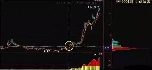 我们从图中看到,经过时间的推移,磨底。指标所示位置的筹码已经集中于6元之下而之前7元筹码集中区已经发生了改变。筹码向低位转移。说明很多被套的人,扛不住长期的底部盘整,选择在底部割肉卖出。主力乘机在底部获得大量廉价筹码,完成吸筹所以后期爆发了强势行情。