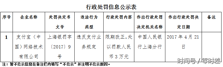 5月10日,中国人民银行上海分行行政处罚信息公示显示,支付宝因违反支付业务规定,被处以罚款人民币3万元并限期整改。