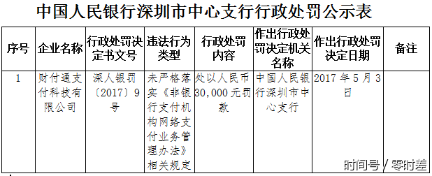 同日,中国人民银行深圳市中心支行行政处罚公示显示,财付通因未严格落实《非银行支付机构网络支付业务管理办法》相关规定,亦处以罚款人民币3万元。