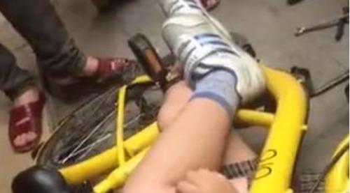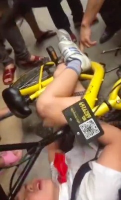 从视频中可以看到,一辆小黄车和一个小男孩倒在路边,围观人群挤在周围。小男孩一边呼喊着“不要动,我要消防车,消防车,”一边跟站在一旁的女性说,“对不起妈妈,你别告诉爸爸……我再也不踩车了,死都不踩了。”