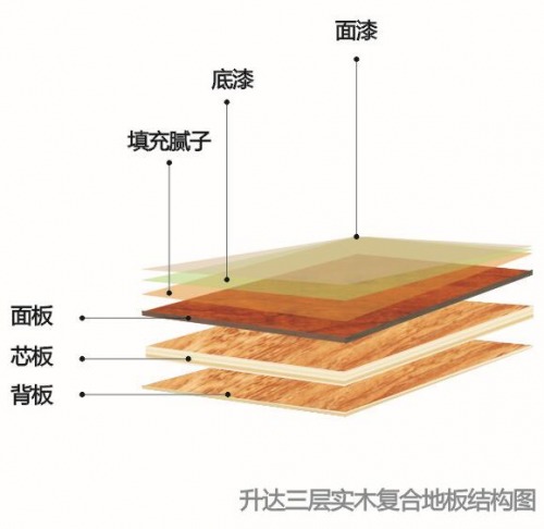 升达三层实木复合地板,由表板、芯板、背板三部分严格按照特定的组坯方式,含水标准,木材要求及其他技术要求高温高压复合而成,表板一般为3-6毫米的名贵树种锯切而成,芯板通常采用软木类(如松木、杉木、杨木)。其被锯切成条块状分布于三板之间,背板为旋切单板,一般树种为杨木、松木、桦木、椴木等。三层实木复合地板三版厚度一般为4:9:2或3:9:2号称地板的黄金比例。