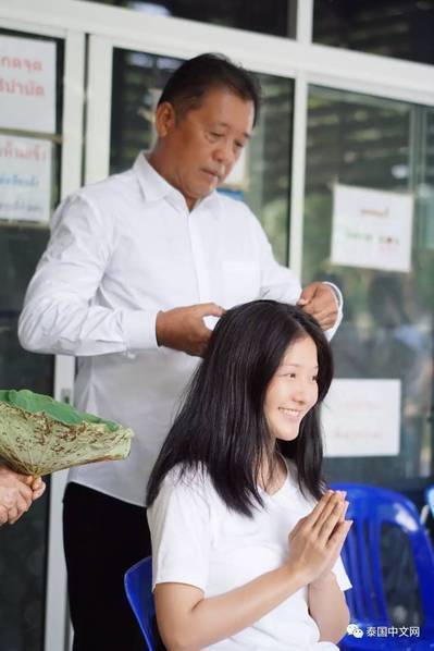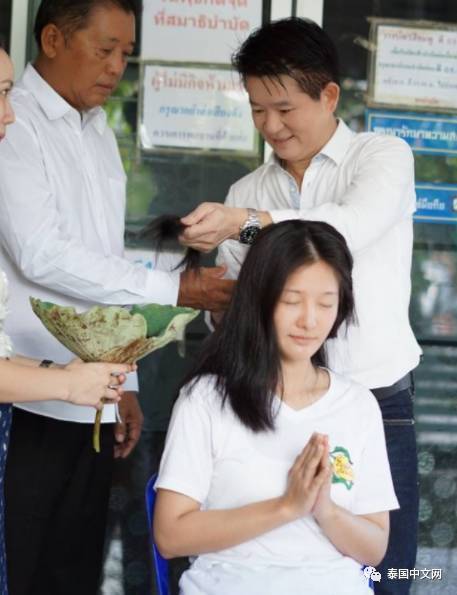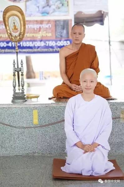 当天,一身素颜的她在家人、朋友的陪同下,来到泰国素攀府(省)某寺庙参加剃度仪式。