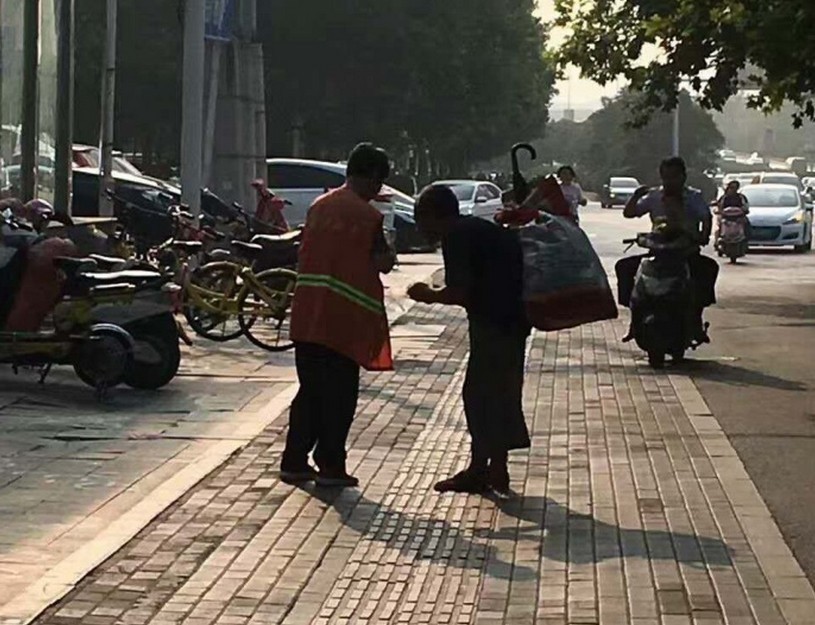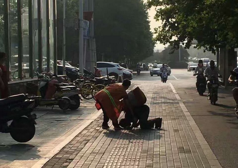 7月4日,据@郑州特警三大队二中队:上班途中,遇到感人一幕,郑州金水路英协路口,一位环卫阿姨将自己带的鸡蛋早餐让给盲人乞讨者吃,还将鸡蛋剥了皮放入盲人口中,这位盲人激动的跪地感谢。网友:善良的人总是这样悄无声息。