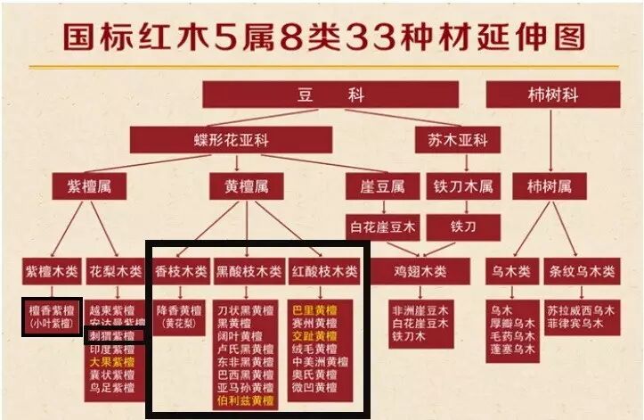 2016年之前,檀香紫檀(小叶紫檀)、交趾黄檀(大红酸枝)、卢氏黑黄檀(大叶紫檀)、微凹黄檀、中美洲黄檀、伯利兹黄檀这六种《红木》国标中的树种已经陆续被收入《濒危野生动植物种国际贸易公约》(CITES)附录二中,巴西黑黄檀被收入《濒危野生动植物种国际贸易公约》(CITES)附录一中。
