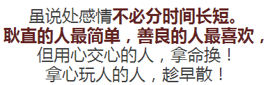 别惯坏了,不知领情的人;别喂饱了,不懂回馈的心。永远记住了:要把诺言,留给诚信的人!要把在乎,留给重情的人!要把坦诚,留给忠厚的人!要把忠义,留给交心的人!要把善良,留给感恩的人!要把真心,留给珍惜的人!