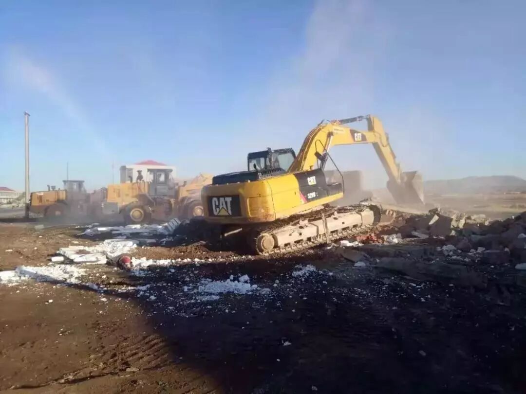 拆除现场,随着指挥长刘艳东宣布集中拆除行动开始,挖掘机、降尘雾炮车、铲车等10余台大型机械设备同时作业,对违法建筑进行拆除。