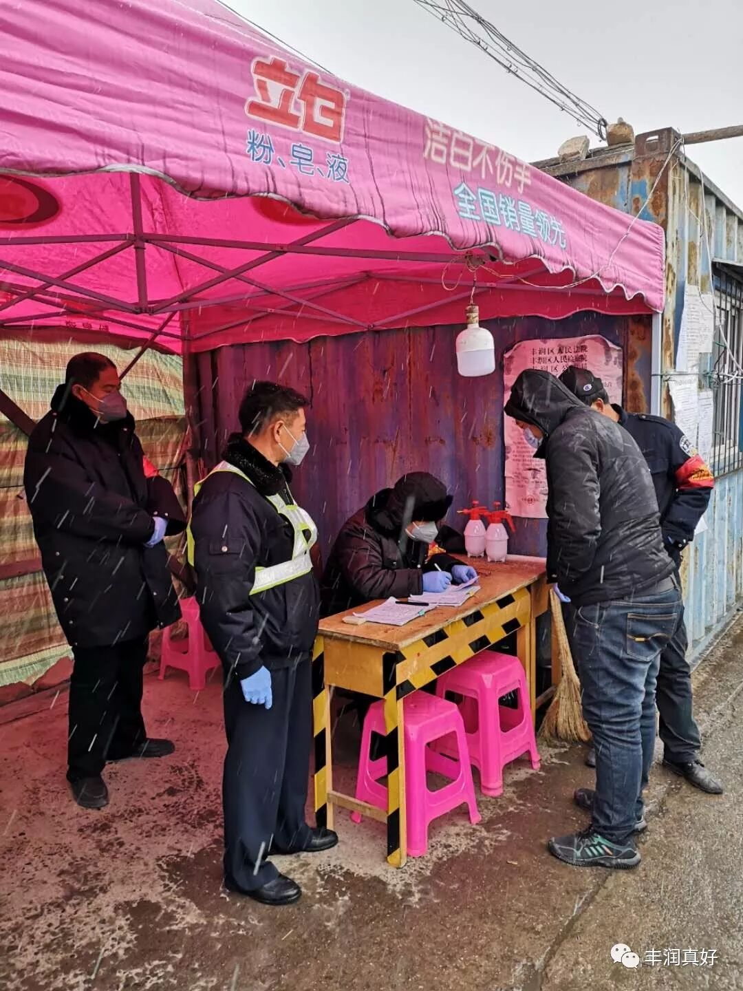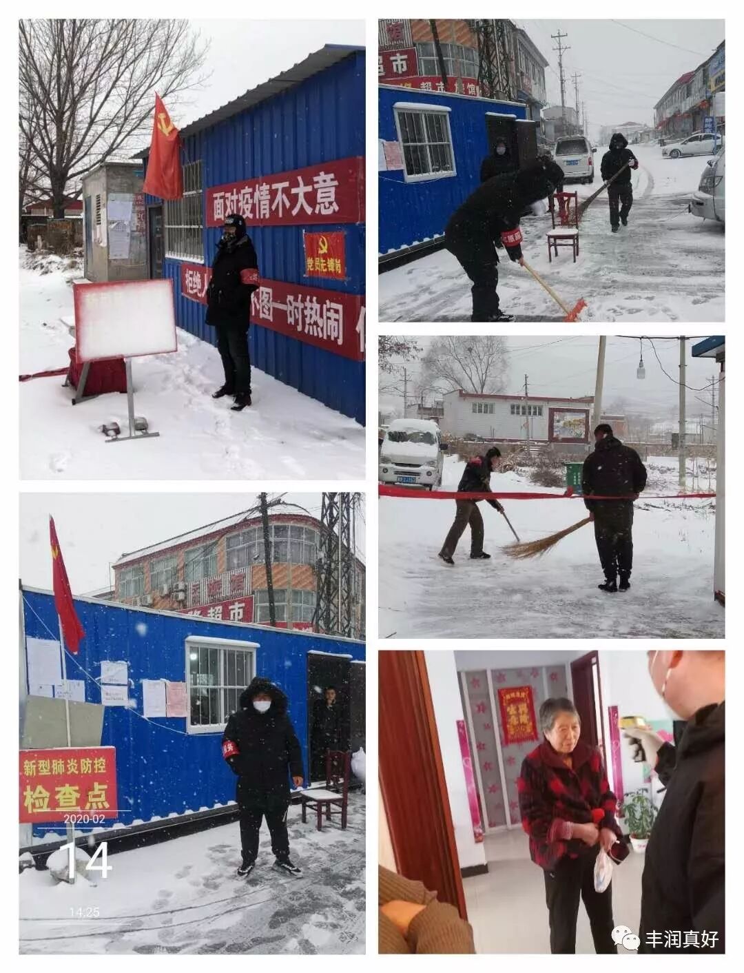 雪洗虏尘静,本是“绿蚁新醅酒,红泥小火炉”的温馨时刻,但志愿者们把满腔期盼和美好期许全化作了岗位上的坚守和维护:登门入户逐人测温,顶雪执勤,爱心劝返……机关、各村的工作人员、志愿者们准时到岗守岗,有条不紊开展防控工作,落实网格员责任,认真排查登记,定时全面消毒,张贴派送宣传资料……