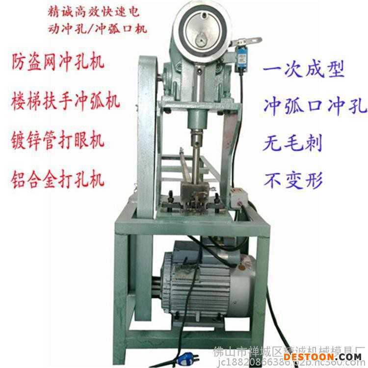 佛山精诚机械模具制造厂--研发的新型不锈钢管冲孔机,是目前不锈钢管材冲孔加工行业最先进实用新型设备。一机可以定做安装多套模具,模具设计采用全封闭式,数据分析冲孔可达五万次,百分百保证操作时无工作危险,整体自动调正冲孔模具自带刻度尺定位杆,冲孔不需要画线,可随意调冲双孔、单孔,装卸模具快速,简单方便。技术含量低,简单易懂,比传统的台钻效率更快,更安全可靠、实用耐磨!防盗网电动冲孔机采用100型号变速箱,冲孔压力可达8T,可冲不锈钢管实厚1mm,符合防盗网、护栏制作加工冲孔需求!一天可冲管材350条或防盗网300—500个平方,可生产各种新型防盗网(菱形防盗网、梅花管防盗网、圆管方管防盗网,亦可以做门花等)。楼梯扶手、护栏的U形口可以一冲压成型,无需再经任何加工。是不锈钢制作加工户和管材经销商最理想的加工机械。手动防盗网冲孔机,其主要特点:机台便宜、轻型、方便移动!冲孔平整、效率快!一天可不锈钢管冲防盗网200——300平方,冲孔不需划线,模具自带定位标尺!调试模具简单,几分钟就能调试完毕,操作简单方便,是目前最适宜不锈钢管防盗网制作加工的冲孔机械! 液压电动 手动冲孔机广泛应用于不锈钢管、铝合金型材、锌钢护栏、铁管等五金制品的冲孔加工。本厂可为客按规格定做各种五金加工小型机械设备。