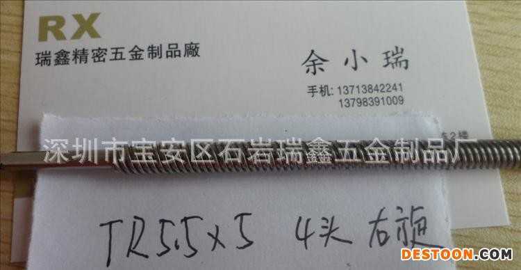 深圳市瑞鑫五金制品有限公司成立于2008年,工厂位于交通便利的广东省深圳市石岩镇(水观高速附近),地理位置得天独厚,本公司是一家有多年专业制造高精密丝杆的公司,引进全球先进全套型生产线,高精密冷轧机床、数控精密机床、精密数控磨床及各类检测制造设备。本公司专业生产各类螺杆、丝杆、蜗杆、电机轴、不锈钢管接头,集开发、制造、生产、营销于一体的技术性生产企业。产品广泛应用于按摩椅、各类阀门、电机等石化类、机械类产品。提供国内梯形丝杆业界最完善的产品系列服务,最大直径:45mm,最小直径2mm,长度:200mm,螺距(导程):0.5-24mm,多头高速丝杆螺距(导程):50mm以内,是最大能生产单头和多头及非标的厂家。