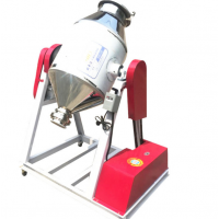搅拌机360度旋转,翻转,搅拌机半中间有搅拌叶片。搅拌机运转的时候搅拌叶片同时转动,旋转的双锥筒使筒体内物料产生紊乱翻滚混合,高速旋转的搅拌叶片打碎结团物料,使物料在筒体内快速混合。