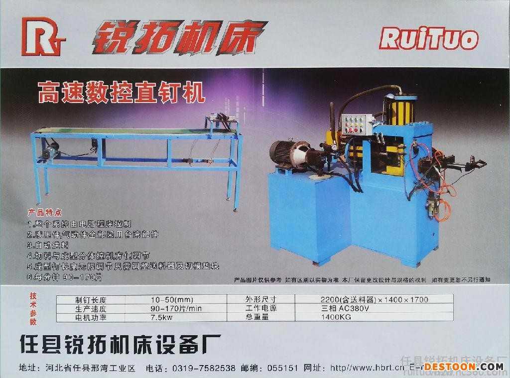 本公司供应制钉机,品牌锐拓机床,型号优质。参数为:重量 1400/kg,实验压力 标准,功率 7.5/kw,长度 2200*1400*1700/mm。质量保证,欢迎咨询洽谈。